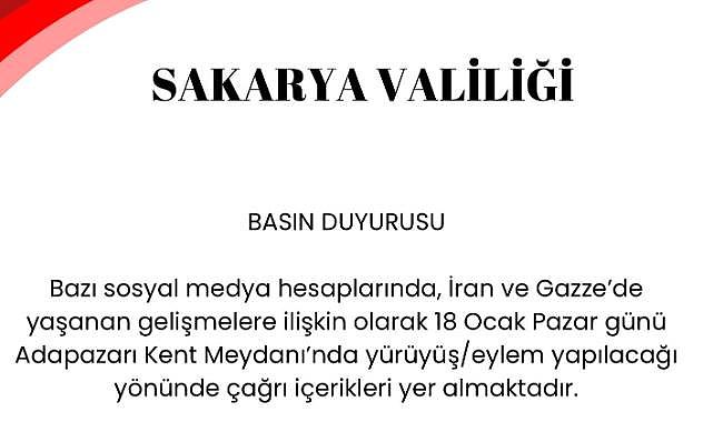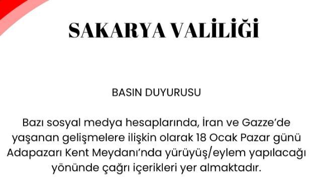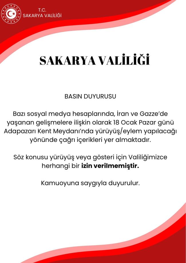 BASIN DUYURUSUBazı sosyal medya hesaplarında, İran ve Gazze'de yaşanan gelişmelere ilişkin olarak, 18 Ocak Pazar günü Adapazarı Kent Meydanında yürüyüş ve eylem yapılacağı yönünde çağrı içerikleri yer almaktadır.Söz konusu yürüyüş ve gösteri için Valiliğimizce herhangi bir izin verilmemiştir. Kamuoyuna saygı ile duyurulur.
