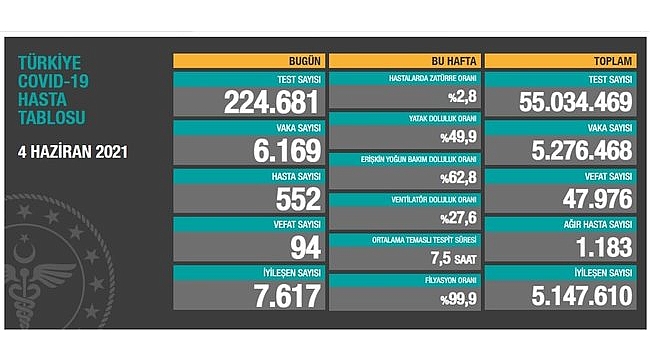 Türkiye'de son dakika corona virüsü gelişmelerini, vaka ve ölüm sayılarını her akşam paylaşan Sağlık Bakanı Dr. Fahrettin Koca, 4 Haziran günü vaka ve ölüm sayıları hakkında güncel bilgileri yaptığı son dakika açıklaması ile duyurdu.Bakan Koca 4 Haziran Cuma günü 6.169 vakaya rastlandığını açıkladı.