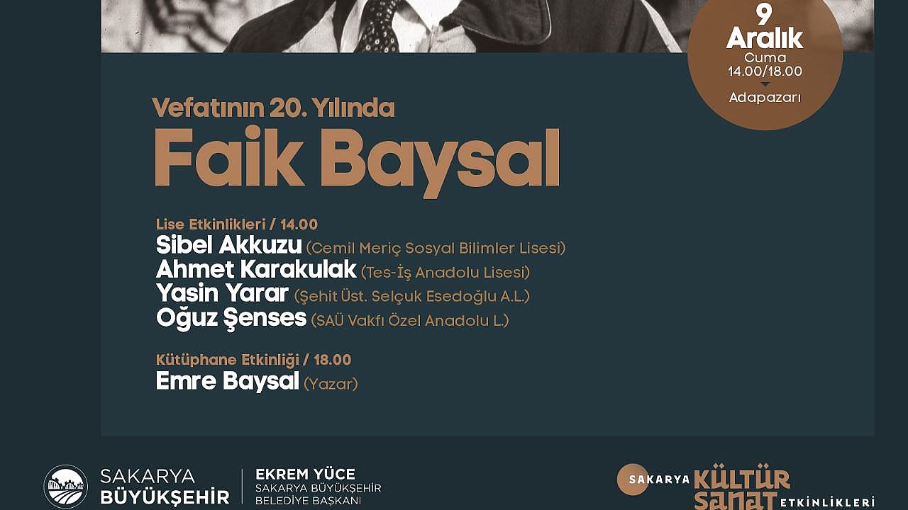 Büyükşehir Belediyesi Aralık kültür sanat etkinlikleri ‘Vefatının 20. Yılında Faik Baysal’ isimli özel etkinlik ile devam edecek.Sakarya Büyükşehir Belediyesi Aralık kültür sanat etkinlikleri ‘Vefatının 20. Yılında Faik Baysal’ isimli özel etkinlik ile devam edecek. 9 Aralık Cuma günü 4 farklı lisede ve Faik Baysal Kütüphanesi’nde gerçekleştirilecek etkinliklerde şehrin yetiştirdiği önemli isimlerden biri olan Faik Baysal’ın edebi anlayışı, yazarlığı ve kitapları konuşulacak. Faik Baysal’ın oğlu Emre Baysal da özel etkinlik kapsamında kültür sanat dostlarıyla buluşacak. Kültür ve Sosyal İşler Dairesi Başkanlığından yapılan açıklamada, vefatının 20. yılında Faik Baysal’ın konuşulacağı programlara tüm vatandaşların davetli olduğu ifade edildi.Özel etkinlik programları şu şekilde;Lise Etkinlikleri / 14.00Sibel Akkuzu – Cemil Meriç Sosyal Bilimler LisesiAhmet Karakulak – Tes-İş Anadolu LisesiYasin Yarar – Şehit Üsteğmen Selçuk Esedoğlu Anadolu LisesiOğuz Şenses – SAÜ Vakfı Özel Anadolu LisesiKütüphane Etkinliği / 18.00Emre Baysal (Yazar)