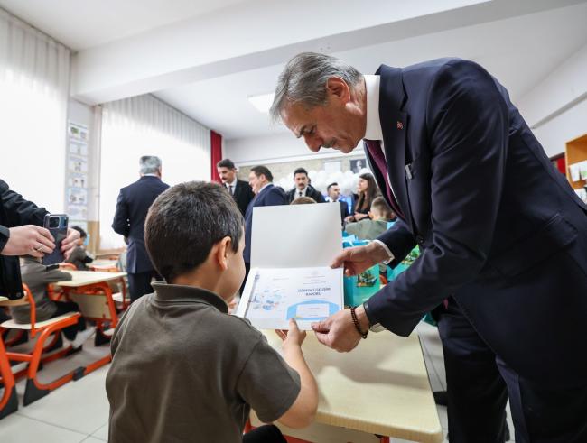 “Geleceğe doğru attığınız her adımda yanınızda biz olacağız”Büyükşehir Belediye Başkanı Yusuf Alemdar, Sapanca Gazipaşa İlkokulu’nda karnelerini alıp tatile çıkan miniklerin heyecanına ortak oldu. Renkli dönem sonu töreninde çocukların sevincini paylaşan Alemdar, çocukların, gençlerin geleceğe doğru attıkları her adımda yanında olacaklarını söyledi. Başkan Alemdar, “Sizler, bu şehrin ve ülkemizin geleceğini inşa edecek, yarınlara yön verecek en kıymetli değerlerimizsiniz. Bizler de her birinizin hayallerine ulaşabilmesi için var gücümüzle çalışmayı, her adımda yanınızda durmayı sürdüreceğiz” dedi.Sakarya Büyükşehir Belediye Başkanı Yusuf Alemdar, 2025-2026 eğitim öğretim dönemi yarıyıl karne törenine katılarak, Sapancalı minik öğrencilerin heyecanına ortak oldu ve sevinci onlarla birlikte yaşadı.Tatil hediyeleri Alemdar’danSapanca Gazipaşa Mahallesi’nde bulunan Gazipaşa İlkokulu’nda düzenlenen törende karnelerini alan minikleri tebrik eden Alemdar, iyi tatiller diledi ve miniklere başarılarından dolayı hediyeler verdi.Yoğun katılımYoğun bir katılımla gerçekleşen programa Sakarya Valisi Rahmi Doğan, Sapanca Kaymakamı Şaban Arda Yazıcı, Sapanca Cumhuriyet Başsavcısı Muhammed Mustafa Vural, Sakarya İl Milli Eğitim Müdürü Coşkun Bakırtaş, İl Gençlik Müdürü Cemil Boz, Sapanca Belediye Başkanı Nihat Arda Şahin, SATSO Başkanı Akgün Altuğ, Sapanca AK Parti İlçe Başkanı Şafak Başoğlu, okul müdürü, öğretmenler ve veliler katıldı.Karne verdi, heyecana ortak olduBaşkan Yusuf Alemdar’ın katılımıyla 1/A sınıfı öğrencileriyle başlayan yarıyıl karne dağıtım programı, diğer tüm sınıflarda aynı anda gerçekleşti.Protokol üyeleri okulun 3’üncü üçüncü katında yer alan ve Çanakkale ile Kurtuluş Savaşı’nı konu alan holü inceledi, öğretmenler odasında eğitimcilerle sohbet etti ve eğitim sürecine dair değerlendirmelere katıldı.“Her adımda yanınızda olmayı sürdüreceğiz”Başkan Alemdar, “Bugün öğrencilerimiz, gösterdikleri gayret ve kararlılığın karşılığını alıyor. Sizler, bu şehrin ve ülkemizin geleceğini inşa edecek, yarınlara yön verecek en kıymetli değerlerimizsiniz. Bizler de her birinizin hayallerine ulaşabilmesi için var gücümüzle çalışmayı, her adımda yanınızda durmayı sürdüreceğiz. Bu özel günde tüm öğrencilerimizi ve onları özveriyle geleceğe hazırlayan değerli öğretmenlerimizi tebrik ediyor, başarılarının artarak devam etmesini temenni ediyorum” dedi.“Güzel bir tatil diliyorum”Öğrencilere iyi tatiller dileyen Vali Rahmi Doğan ise, “Bir eğitim-öğretim yılının ilk dönemini geride bırakırken, öğrencilerimizin gösterdiği emek ve kararlılığın karşılığını aldığını görmek hepimiz için ayrı bir mutluluk. Bu süreçte gayretleriyle öne çıkan tüm öğrencilerimizi yürekten kutluyor, her birini sevgiyle selamlıyorum. Çocuklarımızın gelişimine sabırla rehberlik eden, bilgi ve deneyimlerini özveriyle paylaşan kıymetli öğretmenlerimize de verdikleri emekler için teşekkür ediyorum. Sevgili öğrenciler, yarıyıl tatilini dinlenerek, ailenizle vakit geçirerek ve kitaplarla buluşarak değerlendirmenizi istiyorum” ifadelerini kullandı.Program protokol üyeleri, öğrenciler ve öğretmenleriyle birlikte çekilen toplu fotoğraf ile son buldu.